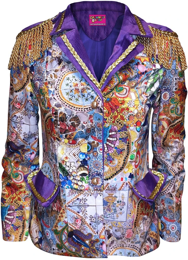 Prachtige gevoerde carnavalsjas voor dames met een diamant- en mozaïek motief. Goed te gebruiken als markiezin jas, maar tevens is de jas geschikt voor elke carnavalsgelegenheid! De jas sluit aan de voorzijde door middel van 3 gouden knopen. Op de schouders zitten epauletten, die ook van de jas af te halen zijn. De jas heeft een paarse voering en is versierd met gouden details. De print-stof is gemaakt van 100% katoen en de voering en paarse kraag van 100% polyester. Ook verkrijgbaar in lange variant en in andere motieven.