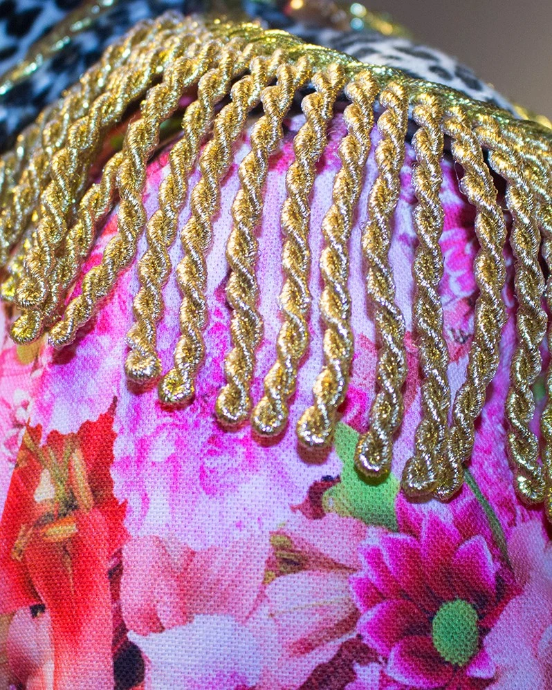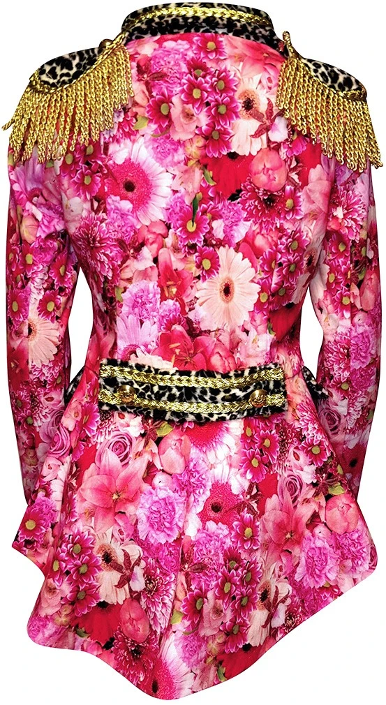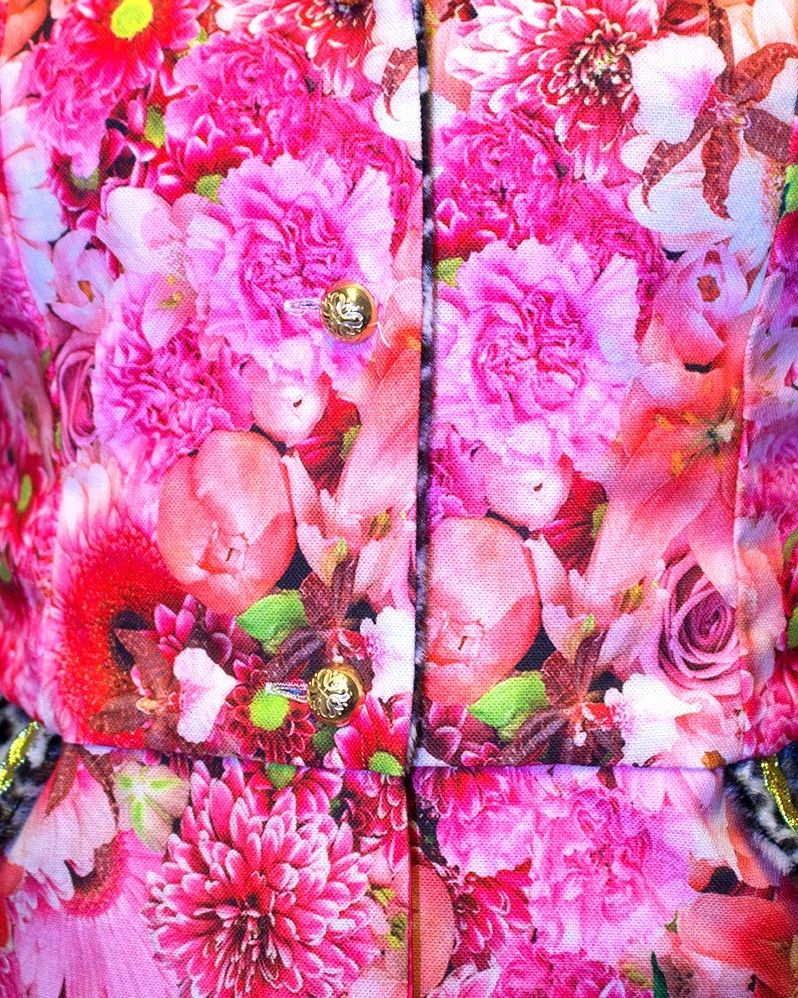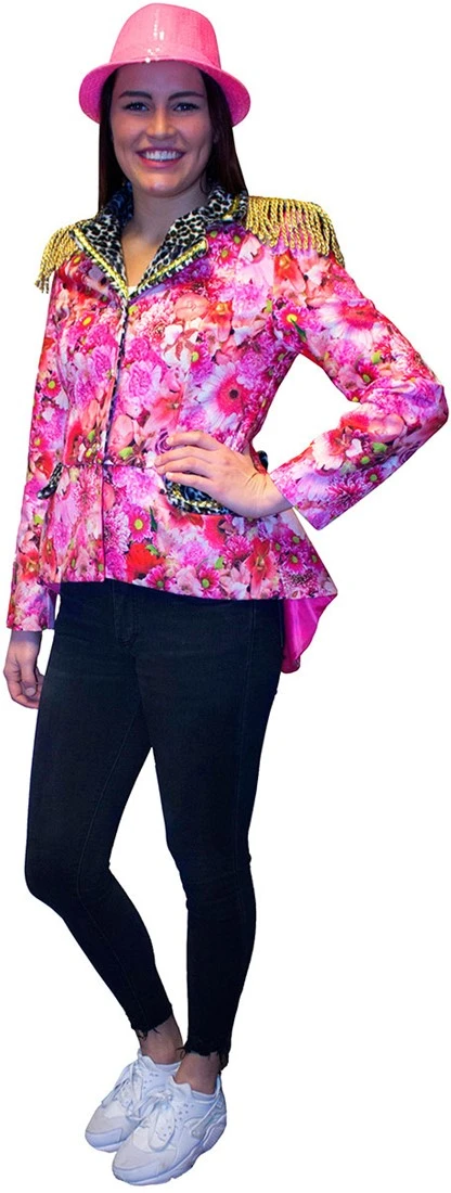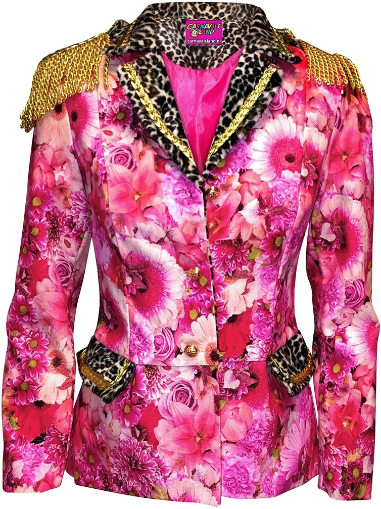 Prachtige gevoerde carnavalsjas met roze bloemen- en panter motief. Goed te gebruiken als markiezin jas, maar tevens is de jas geschikt voor elke carnavalsgelegenheid! De jas sluit aan de voorzijde door middel van 3 gouden knopen. Op de schouders zitten epauletten, die ook van de jas af te halen zijn. De jas heeft een felroze voering en is versierd met gouden details. Het bloemenmotief is gemaakt van 100% katoen en het pantermotief en de voering zijn gemaakt van 100% polyester. Ook verkrijgbaar in lange variant en in andere motieven.