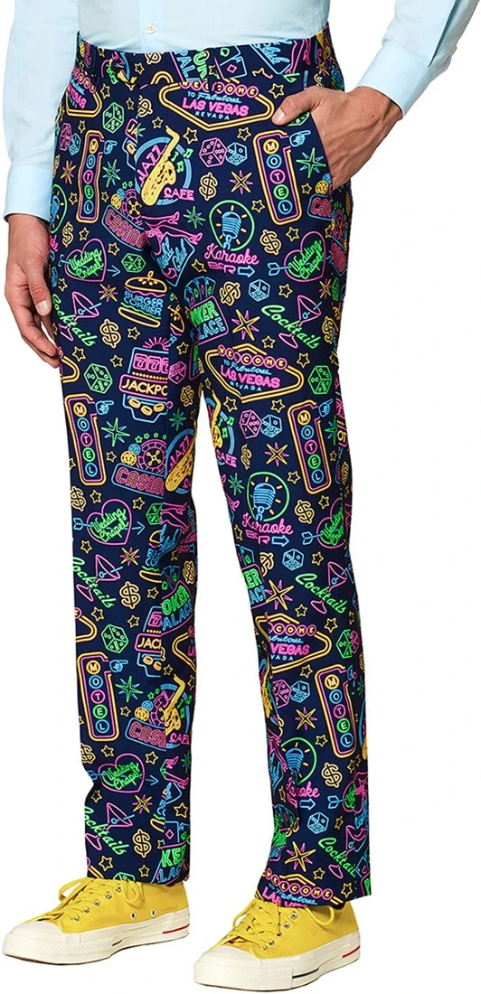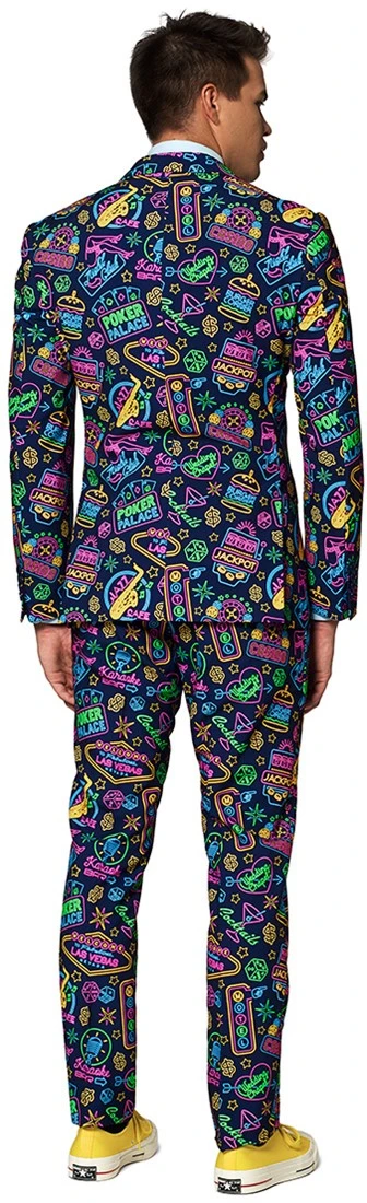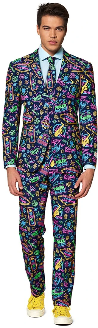 Vivaaaaa Las Vegas! Opposuits brengt met de Mr. Vegas een ode aan Sin City. Dit topkostuum is een heerlijke chaos van de vroegere neon borden uit de gokstad in Nevada. Het wordt geleverd met een stopdas, jasje en een broek. Check dit kostuum en Fold niet. Ga all-in en zorg ervoor dat jij de jackpot van de avond bent! En je weet het hé: “What Happens in Vegas, Stays in Vegas.”