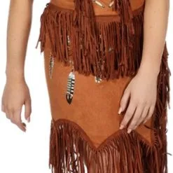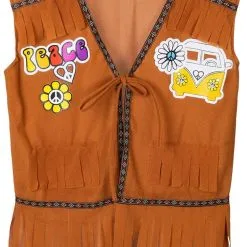 Details jurk: bij de borst zit een bloem (9cm groot), ook hangen er bruine franjes
