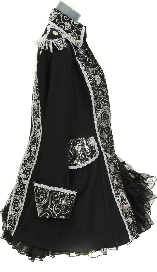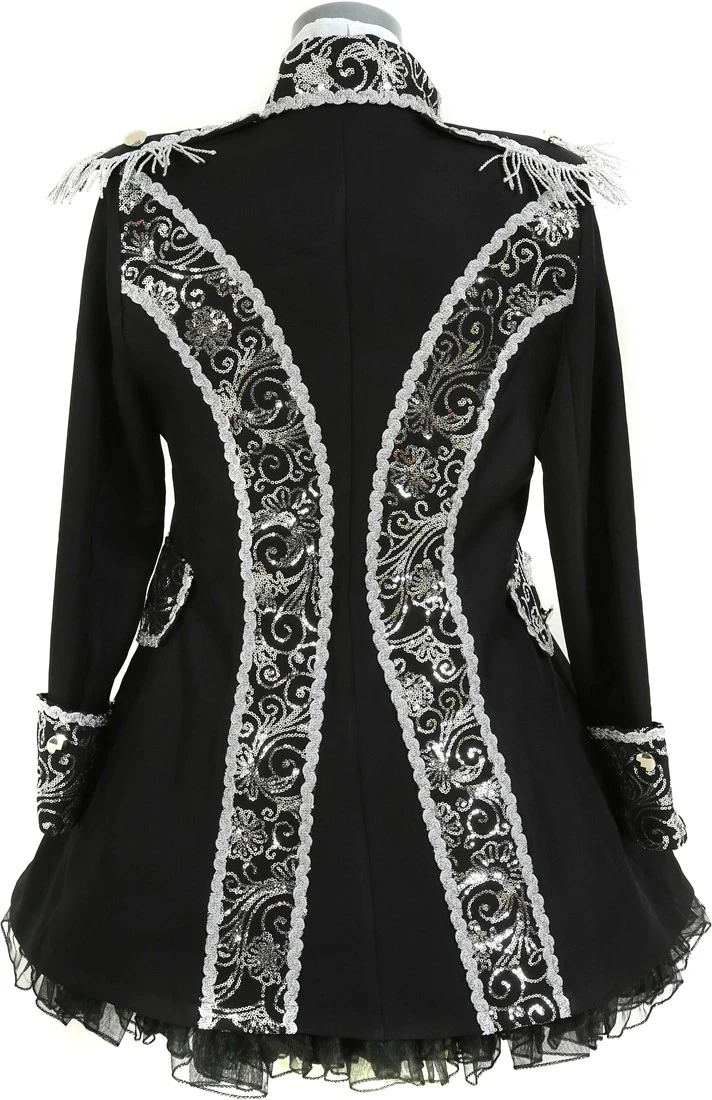 Details: half lange jas met epauletten en op de kraag, mouwen, zakken een sierlijk zilveren pailletten motief, afgewerkt met een zilveren pailletten band en zilveren knopen