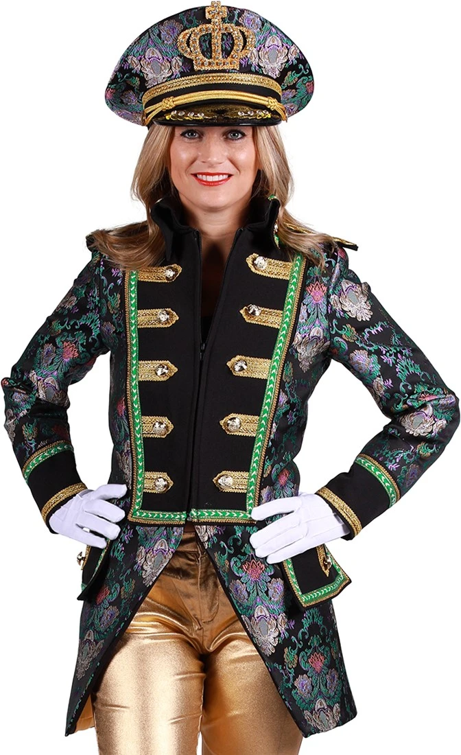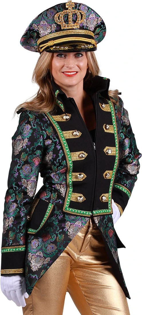 Detail: zwarte epauletten met goud kleurige versiersels