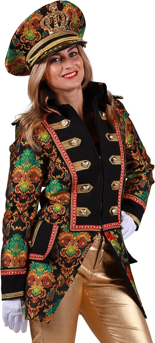 Detail: zwarte epauletten met goud kleurige versiersels