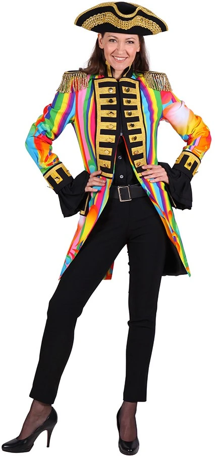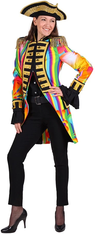 Luxe gevoerde dames carnavalsjas met regenboog motief. Te gebruiken als een markiezin jas, circus jas, maar ook voor de Gaypride is de jas zeer geschikt door de regenboog kleuren. De jas sluit aan de voorzijde door middel van een korte rits. Op de schouders zitten epauletten, welke ook van de jas af te halen zijn. De mantel is gemaakt van 100% polyester. De jas is ook verkrijgbaar in korte variant en in andere motieven.