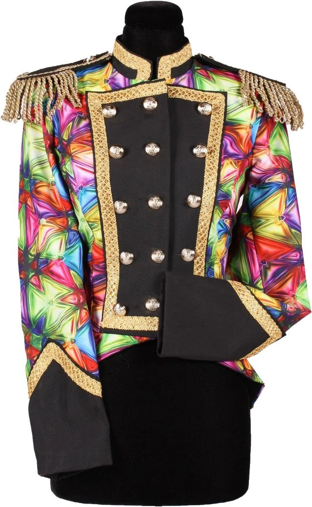 Details: afneembare zwarte epauletten met goudkleurige franjes