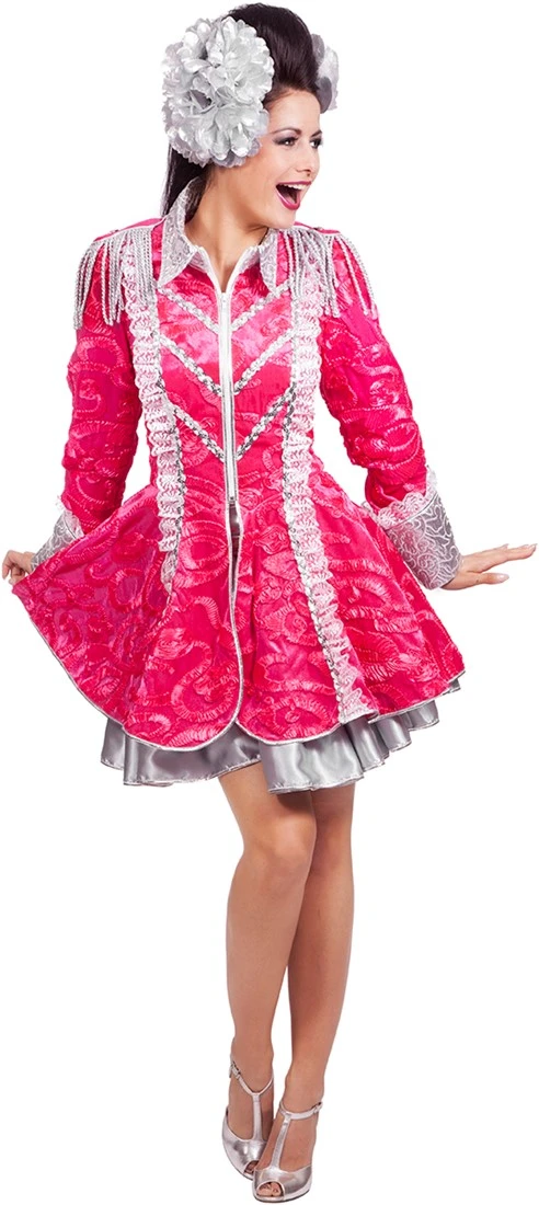 Details: zilveren kraag en mouwen. Ook de details zoals de epauletten en pailletten aan de voorkant zijn zilver. Tot slot zit er aan de voorkant en bij de mouwen nog een kanten detail