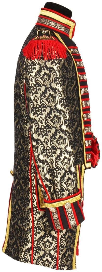 Details: opstaande boord en epauletten op de schouders. De borst, mouwen en zakken zijn versierd met gouden band en zilveren knopen