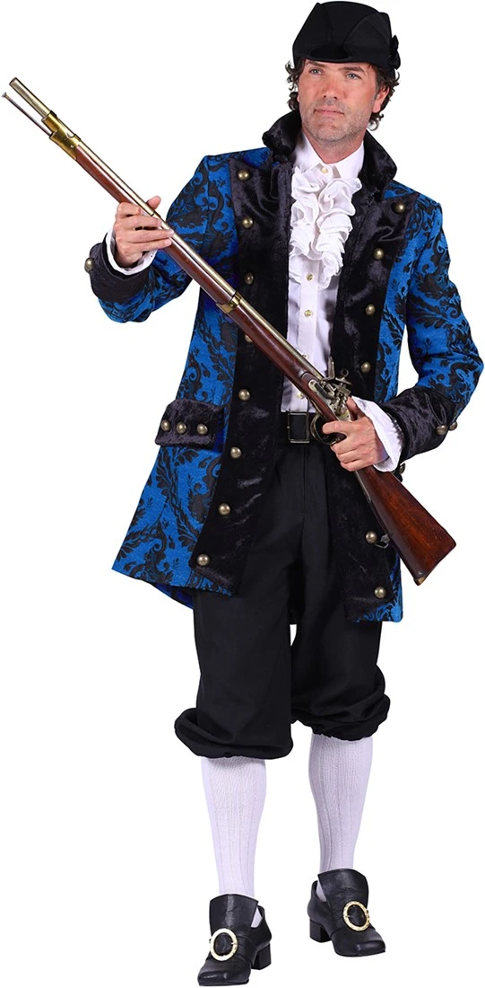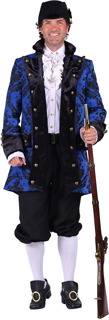 Deze gave blauwe carnavalsjas heeft een motief van zwarte brokaten borduursels. Een stoere jas voor heren om aan te hebben tijdens onder andere carnaval.