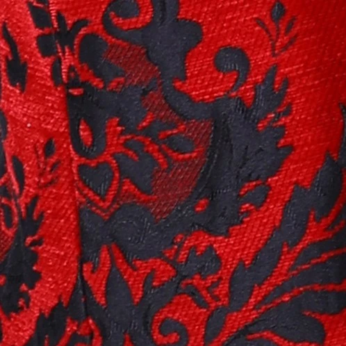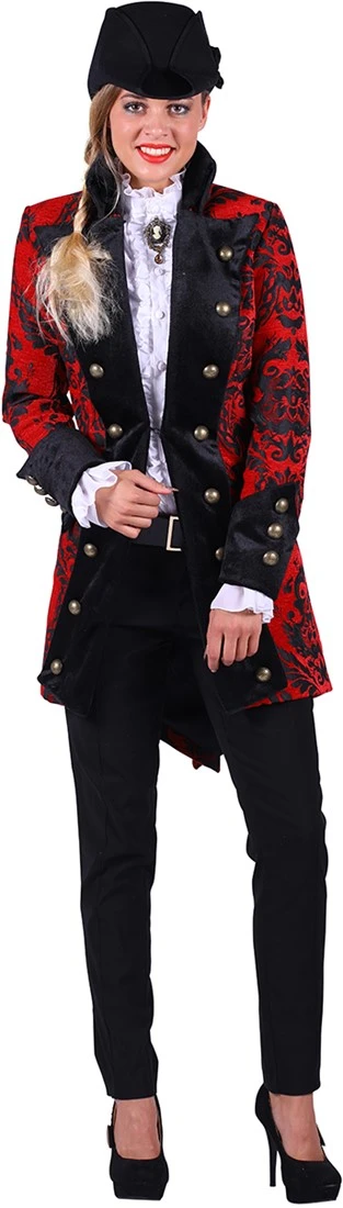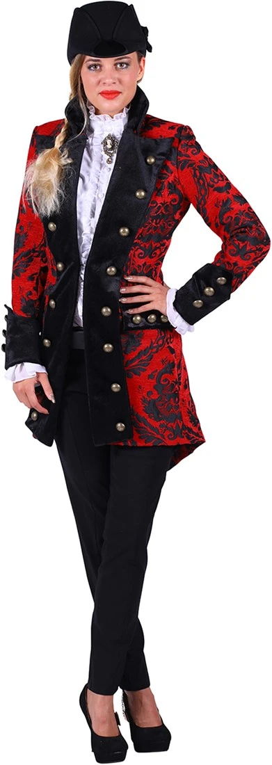 Een gave rode carnavalsjas met zwarte brokaten borduursels. Een stoere damesjas om te dragen tijdens bijvoorbeeld carnaval.