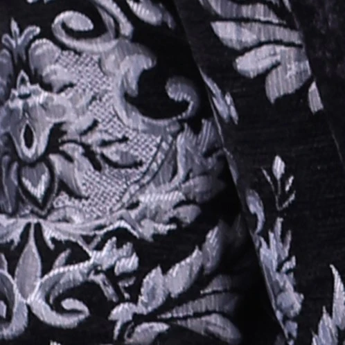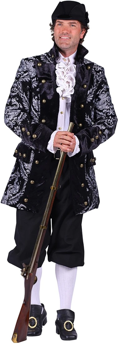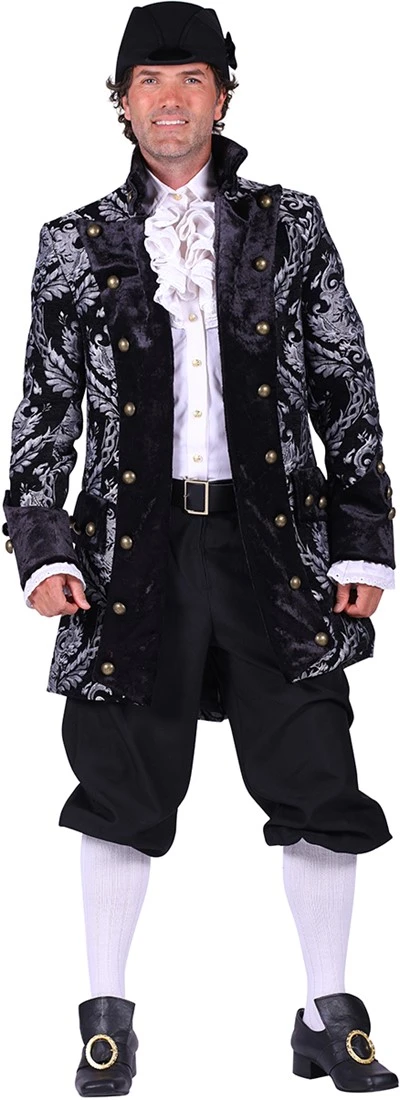 Deze gave zwarte carnavalsjas heeft een motief van zilveren brokaten borduursels. Een stoere jas voor heren om aan te hebben tijdens onder andere carnaval.