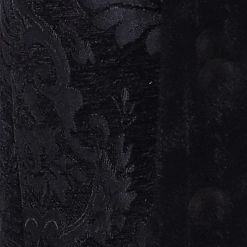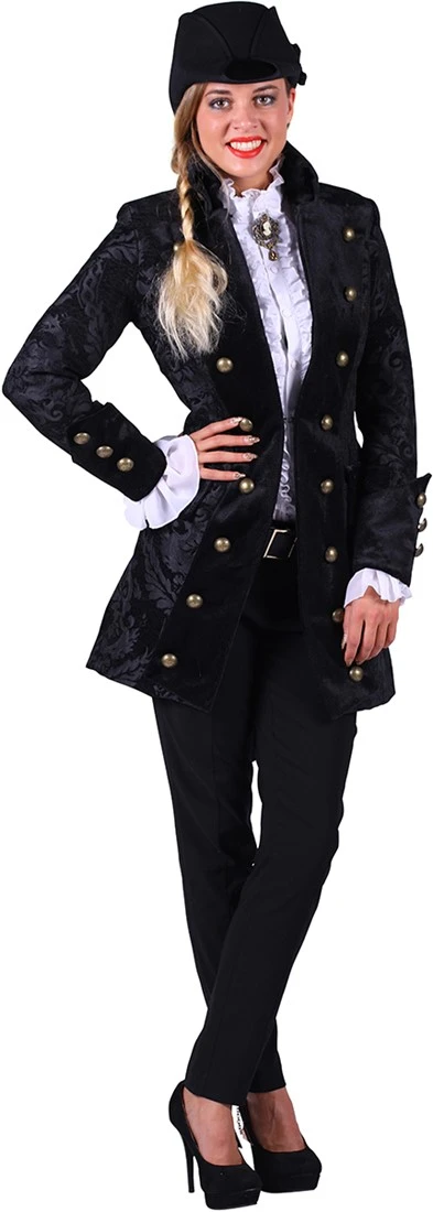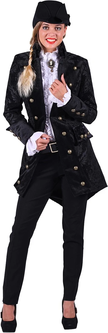 Een gave zwarte carnavalsjas met zwarte brokaten borduursels. Een stoere damesjas om te dragen tijdens bijvoorbeeld carnaval.