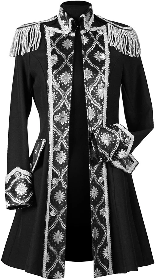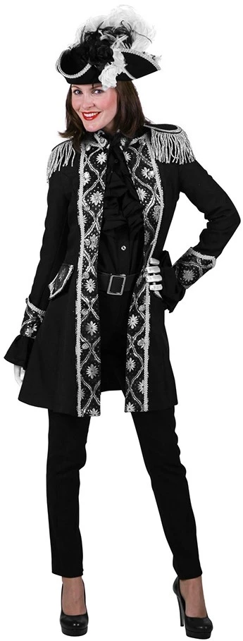 Mooie zwarte dames jas met vele zilveren accenten. De jas “Silver Bird” heeft bij de knopen, kraag, zakken en uiteindes van mouwen een zilveren patroon met bloemen. De jas heeft op de schouders zwart met zilveren epauletten. Deze worden inclusief geleverd.