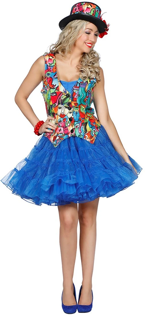 Een gaaf gilet voor dames, met een Picasso-print. Op de print zie je de typerende kubistische gezichten en relle kleuren die vroeger door Picasso gebruikt werden. De voering en de achterkant zijn beide turquoise met een satijnen look&feel. Het vest is te sluiten met 3 knopen bij de middel.