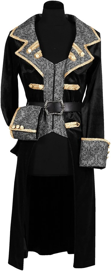 Een lange zwarte damesjas met allerlei gouden details zoals gouden lijnen en knopen. De jas is gemaakt van 100% polyester en wordt inclusief riem geleverd.