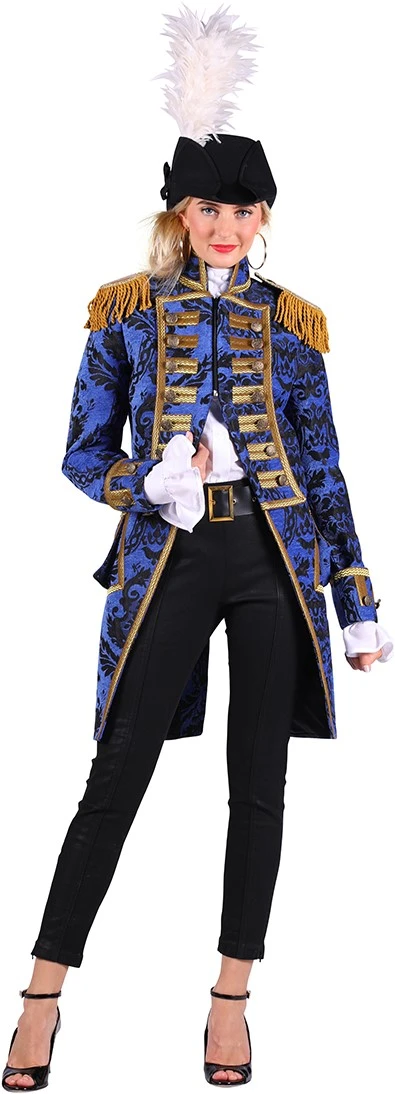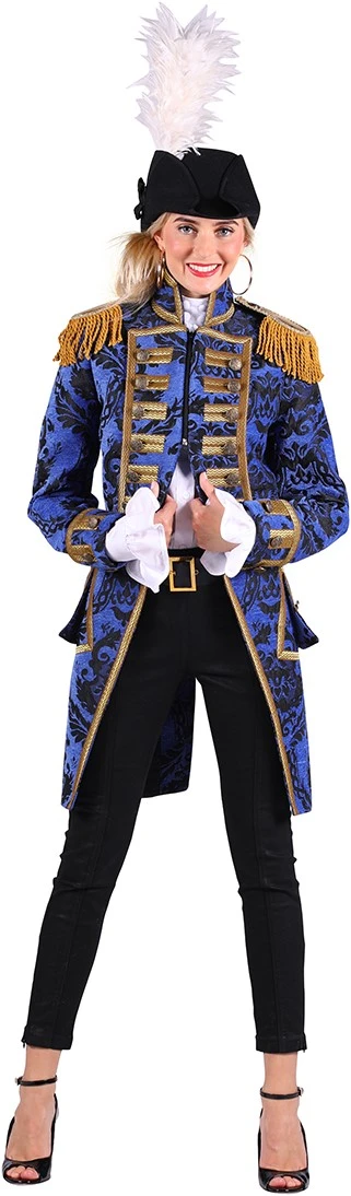 Details: op de schouders zitten gouden epauletten met goudkleurige franjes. Aan de voorzijde zitten voor de sier goudkleurige knopen. De jas is afgewerkt met goudband.