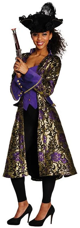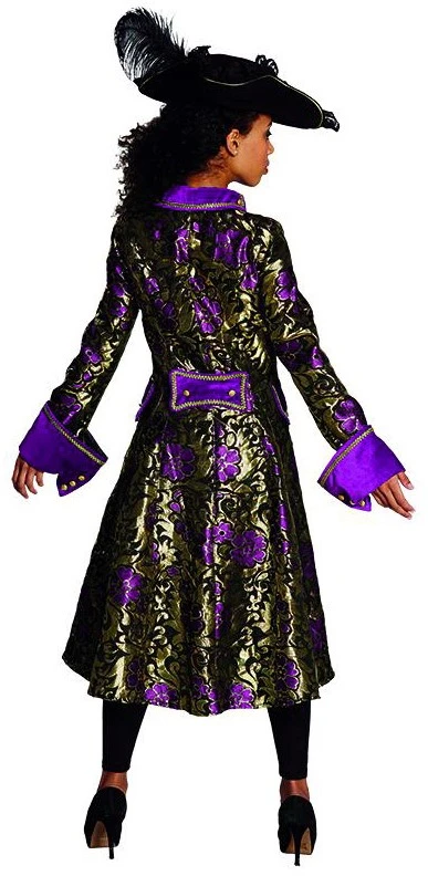 Een gave mantel om als piraat of markiezin aan te doen, met gouden en paarse versiersels met een print van bloemen.
