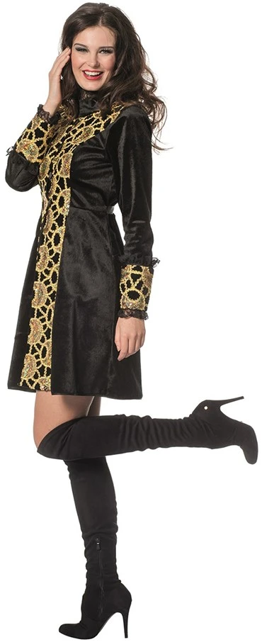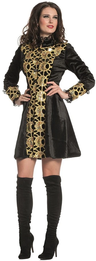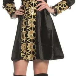 Details: Aan de rand van de mouwen en de rand van de hals zit zwart kant. In het gouden patroon zitten pailletten verwerkt.