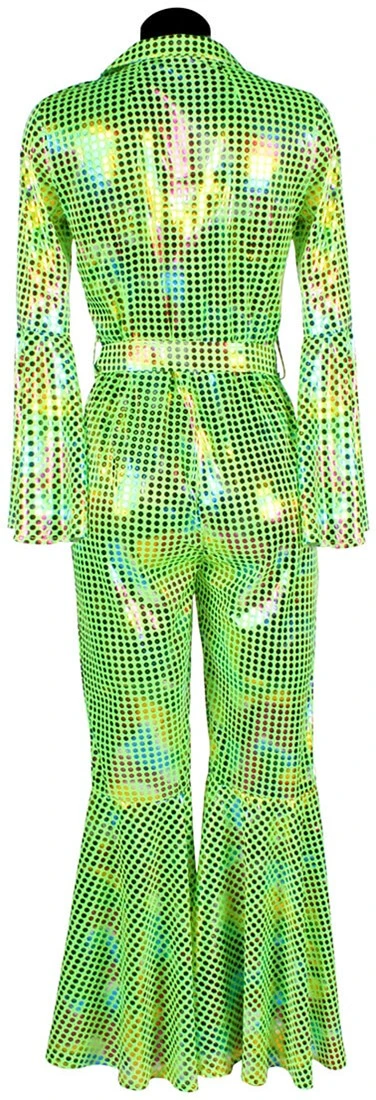 Details: pailletten over het gehele kostuum, uitlopende mouwen en broekspijpen