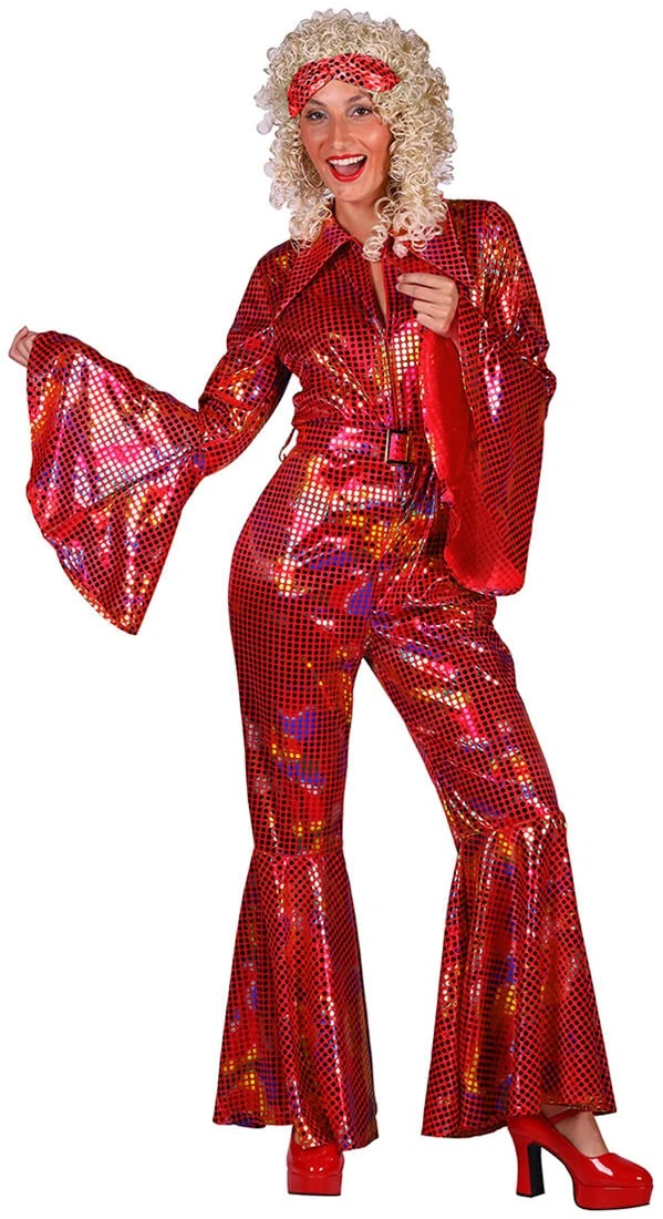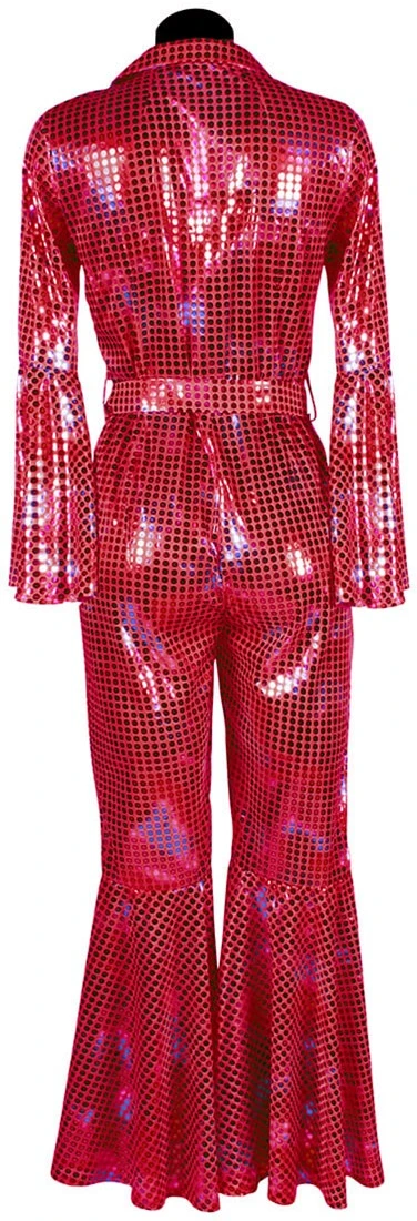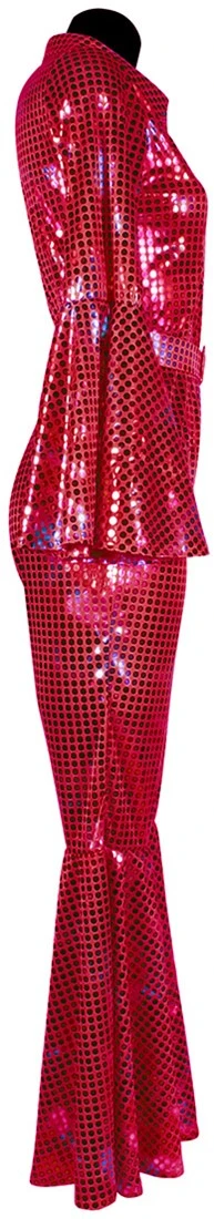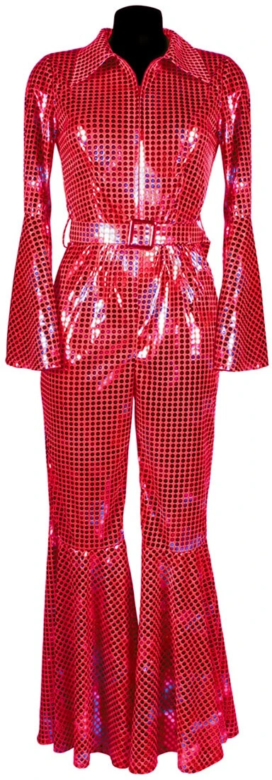 Details: pailletten over het gehele kostuum, uitlopende mouwen en broekspijpen