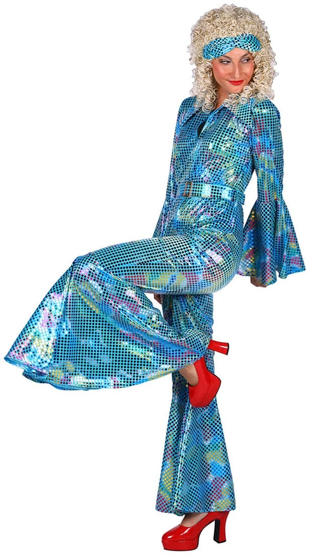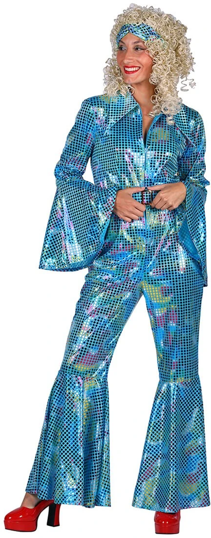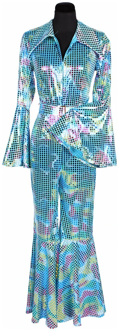 Details: pailletten over het gehele kostuum, uitlopende mouwen en broekspijpen