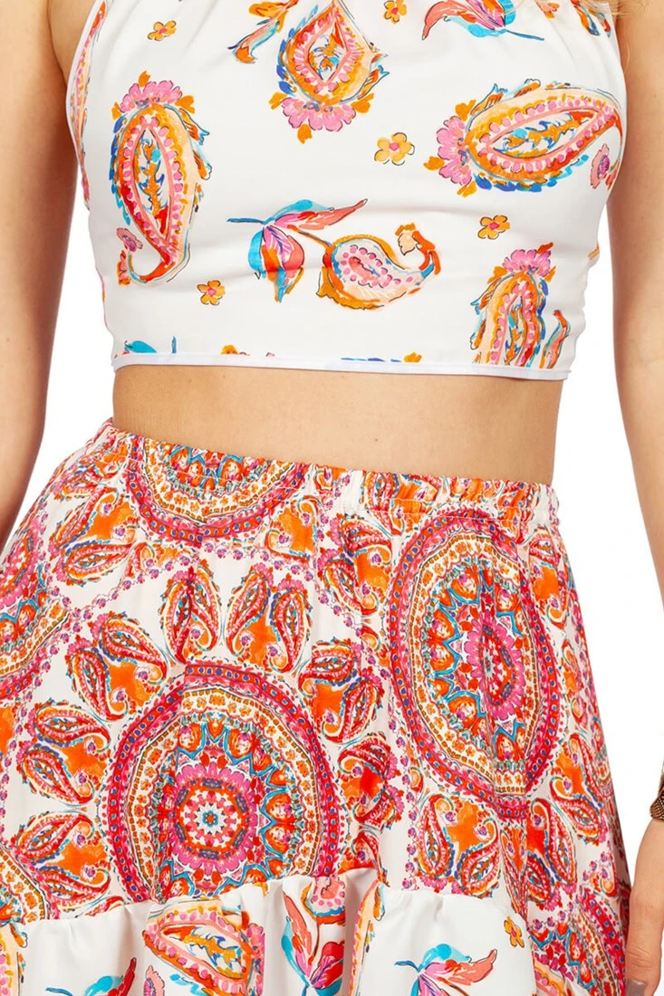 Met deze combi set in zomerse paisley print kom je stijlvol voor de dag op ieder festival of zomerse party. De elegante high low rok heeft het pittige van een mini rok en creëert lengte door de mooie lange achterzijde. Maak je outfit helemaal compleet met een leuke hoed in Ibiza of western stijl en je kunt de vrijheid weer vieren.