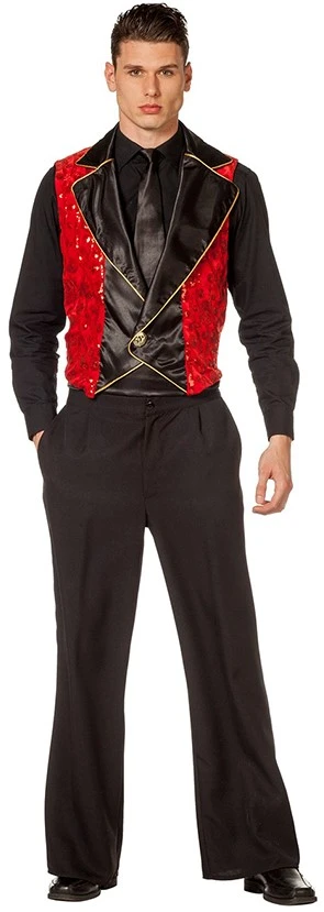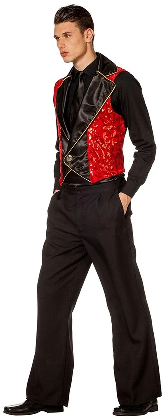 Heren Showvest Rood Luxe met gouden opdrukken en dicht te doen middels een knoop. Ook verkrijgbaar voor dames.
