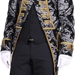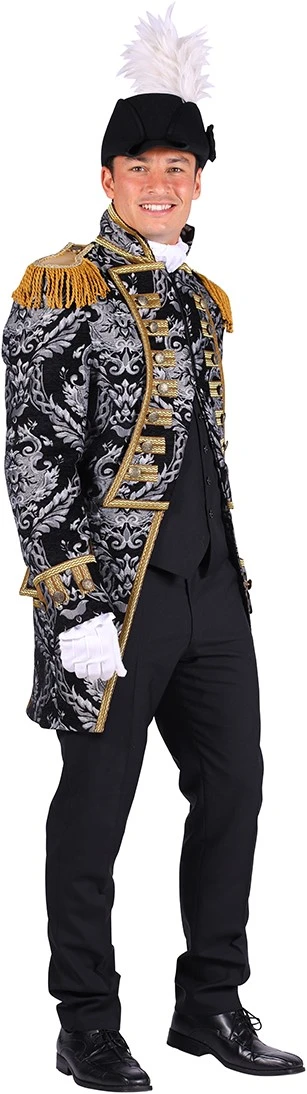 Details: op de schouders zitten gouden epauletten met goudkleurige franjes. Aan de voorzijde zitten voor de sier goudkleurige knopen. De jas is afgewerkt met goudband.