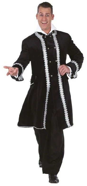 Een zwarte markiezenjas die ook te gebruiken is voor een piratenkostuum. De zwarte jas heeft zilverkleurige details.