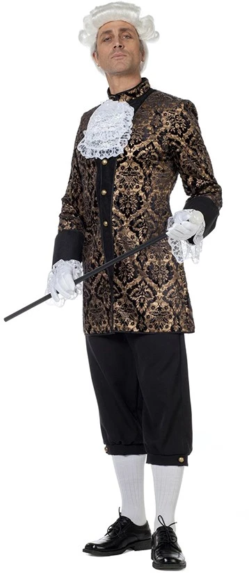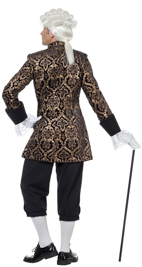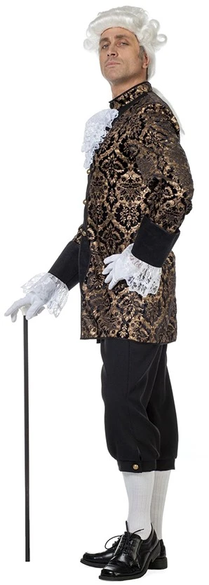 Details Jas: goudkleurige barok patroon. Aan de voorkant zit een wit kanten jabot en aan de uiteinden van de mouwen zit wit kant