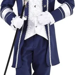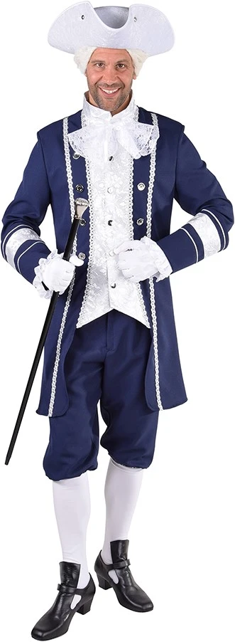 Mooi blauwe markiezen kostuum voor heren. Het kostuum bestaat uit een bovenstuk met befje en een broek.