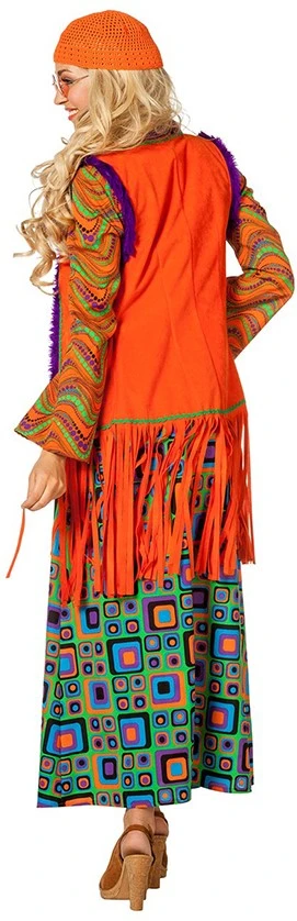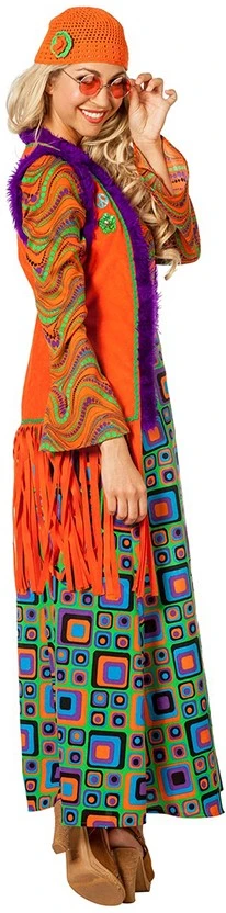 Mooie lange hippie jurk met vrolijke motieven! Vest zit aan de jurk vast. Overige accessoires niet inbegrepen.