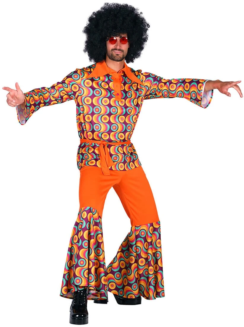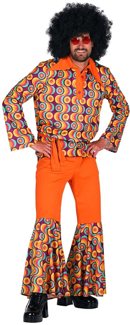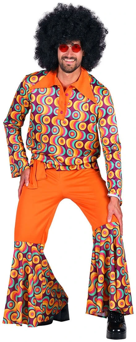 Details broek: wijd uitlopende broekspijpen en twee kleurig, oranje en multi