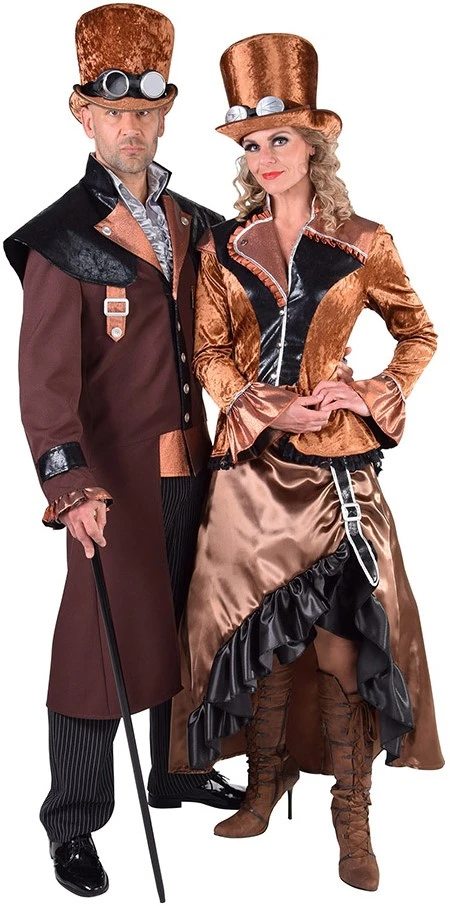 Mooie steampunk jurk met een bronzen kleur. Het bovenstuk zit vast aan de rok. Gemaakt van 100% polyester. Let op: exclusief accessoires.