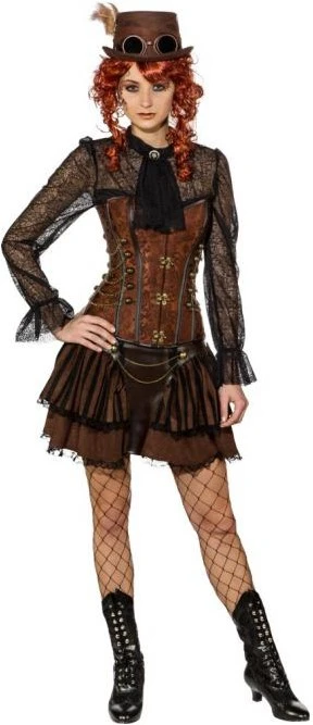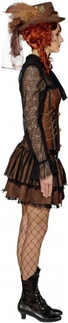 Prachtig bruin korset voor een steampunk outfit. Het korset is te sluiten met 4 antiek-uitziende gouden sluitingen aan de voorzijde en het is bezaaid met metalen details. Ook is het korset voorzien van baleinen en een rijgsluiting aan de achterzijde. Gemaakt van 90% polyester en 10% elastaan. Bijpassende rok, blouse, hoed, pruik, panty en nethandschoenen zijn apart verkrijgbaar.