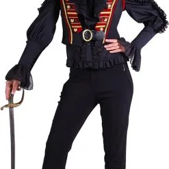 Luxe Piraten/Steampunk vest voor dames, dit is een stoere luxe vest met veel details zoals een riem met een goudkleurige gesp die vast aan het vest zit. Er zitten knopen en gouden details aan de kraag. Super leuk om het te dragen als een piraat of steampunk!Dit vest is gemaakt van 100% polyester.