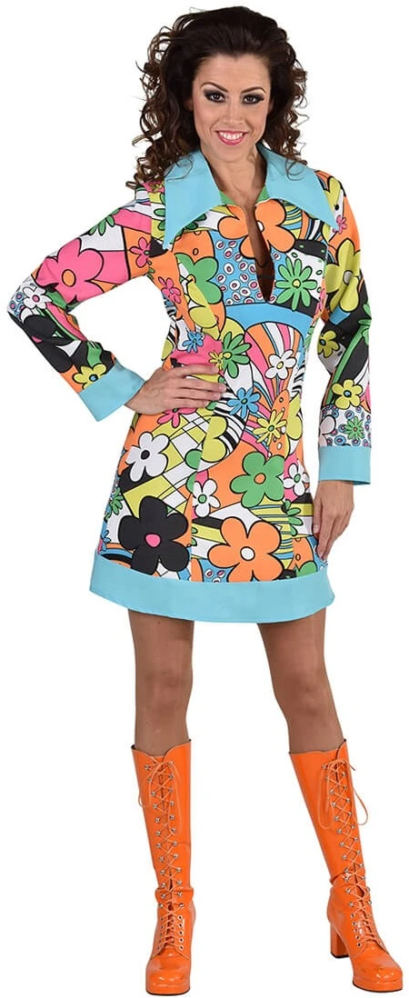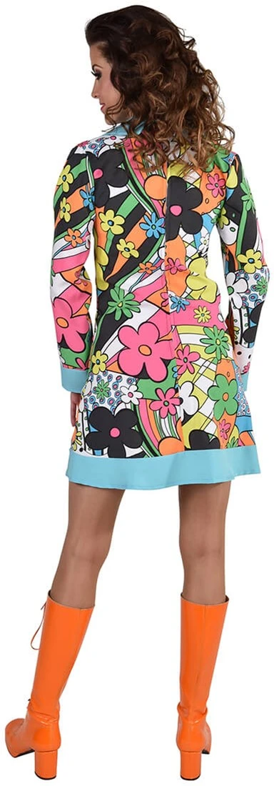 Details: diepe decolleté en puntige kraag. De mouwen, kraag en onderkant jurk zijn in een effen kleur