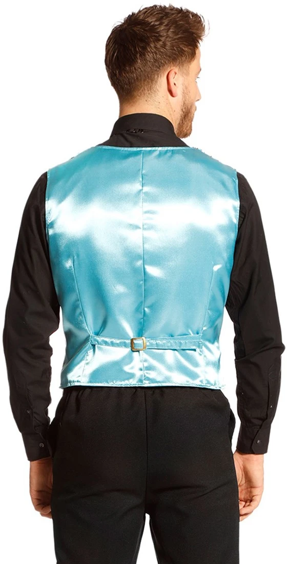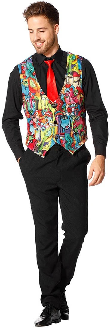 Een gaaf gilet voor heren, met een Picasso-print. Op de print zie je de typerende kubistische gezichten en relle kleuren die vroeger door Picasso gebruikt werden. De voering en de achterkant zijn beide turquoise met een satijnen look&feel. Het vest is te sluiten met 3 knopen bij de middel.